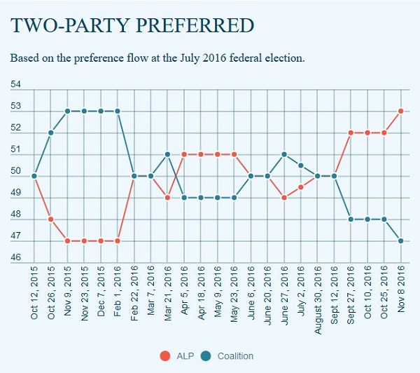 Essential Report also has Labor up 53-47. In primary votes it’s the LNP on 38%, Labor on 37%, the Greens on 10%, One Nation on 6%, and the Nick Xenophon Team up a point to 3%.