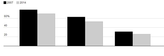 Jotzo and Mazouz in their piece at The Conversation point out that power stations mostly don’t work at full capacity. Here’s the capacity factor for 2007 and 2014, from the left, with brown coal, black coal and gas: