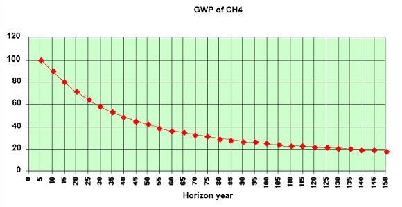 The real problem here is that while carbon which came from the atmosphere to create feed is being returned to the atmosphere, and could therefore be considered a cycle, it is returned in a form that has a greenhouse effect 100 times that of CO2 in the first year, tapering down to 20% as a long-term effect after 100 years. Here’s the relevant graph I have on file. The reference is Dessus, 2008, from memory: