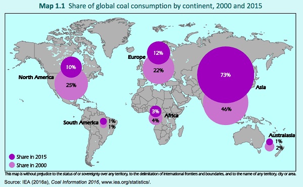 The story of coal has shifted to Asia, with Asia accounting for 46% in 2000, 73% in 2015, and a projected 76% in 2021: