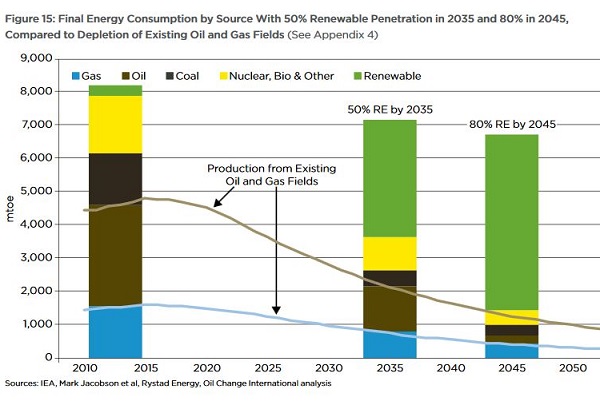 The report recommends a “managed decline” of fossil fuels in favour of cranking up renewables to 50% by 2035 and 80% by 2045, using existing technology:
