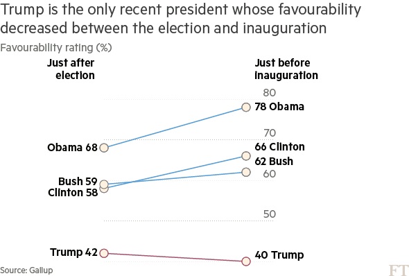 Trump has the lowest approval rating of any newly inaugurated president since Gallup started polling. Here how the transition has gone for the last four: