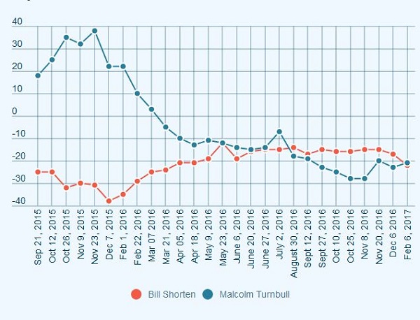 Turnbull has blown the stellar lead of up to 68 points he had in late 2015, to be one point better than Shorten on -21 to Shorten’s -22.