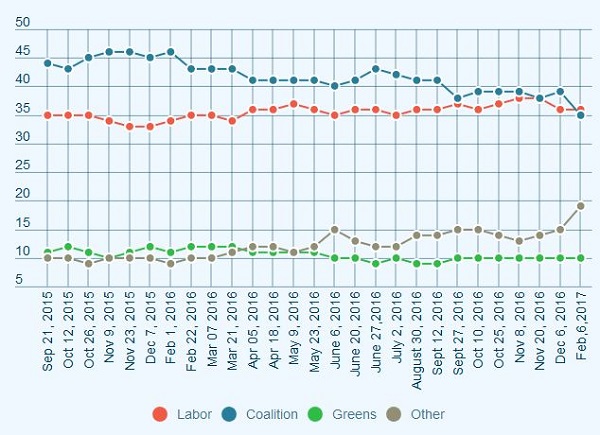 According to Newspoll if an election were held on 6 February this year, Labor would have 85 seats, the LNP 60 and there would be five others: