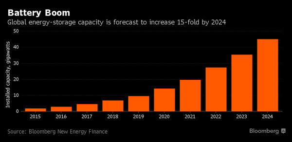Bloomberg suggests that the age of the grid-scale battery is almost upon us. Globally about $2.5 billion will be spent this year, but this will increase 15-fold by 2024:
