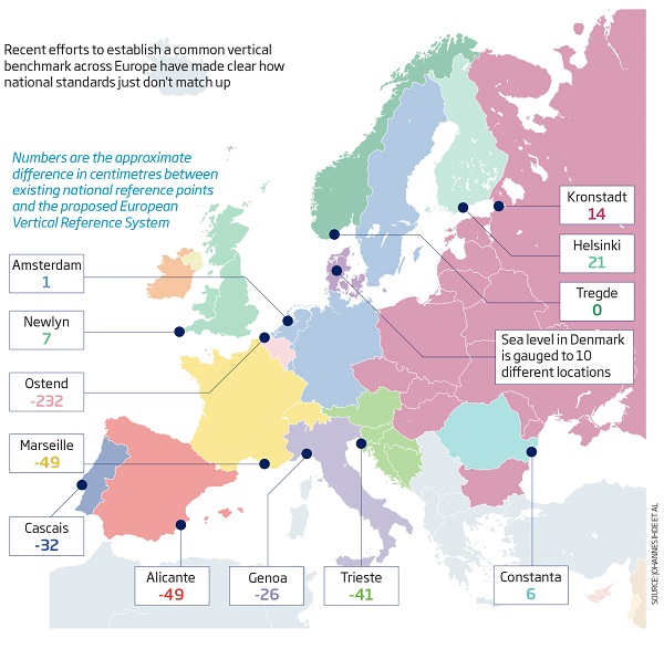 Thing is, the earth is not round, the surface isn’t even, freshwater is less dense the saltwater, water expands with temperature, and countries by and large have their own idea of zero. Sea level is gauged to 10 different locations in Denmark. At least the Germans and the Swedes take their cue from Amsterdam. The Brits have had three goes at straightening out their measurements. The second attempt started in 1912, and was completes in 1952. By that time I’m sure the whole country would have tilted.