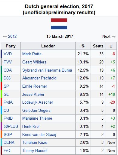 Wilders picked up five seats, to make 20, the second biggest party. Prime Minister Mark Rutte’s People’s Party for Freedom and Democracy (VVD) lost 8, but is still by far the biggest with 33, and will probably form government.