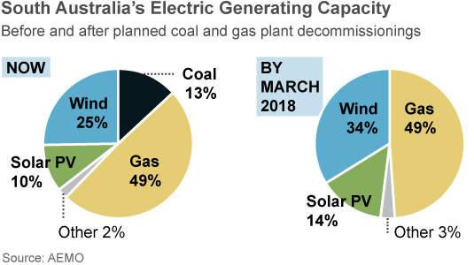 South Australia’s dependency on gas appears to be the greatest of any state. This graph from AEMO in 2015 shows the situation before and after the closure of their only two coal stations: