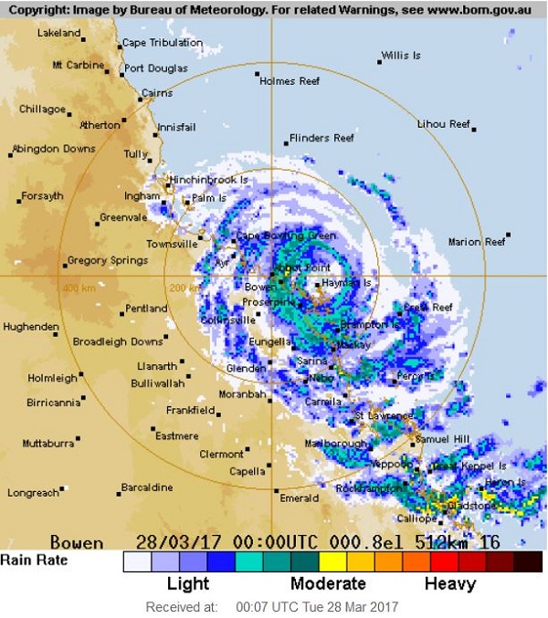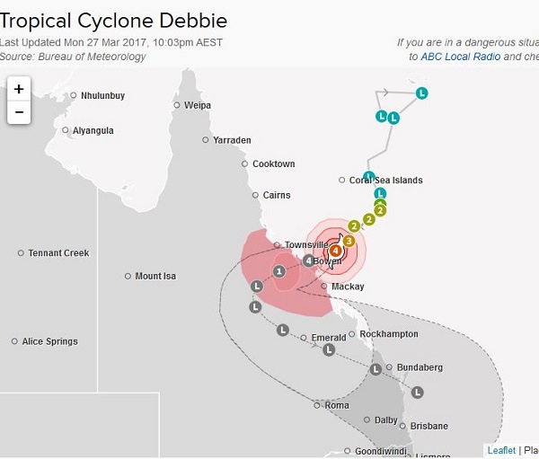 At time of writing, cyclone Debbie is looming to make landfall at Bowen, south of Townsville on the Queensland coast: