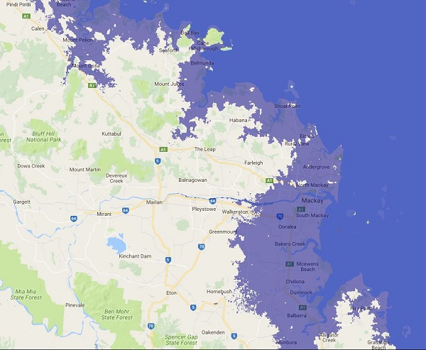 Ultimately, however, sea level rise will be devastating. My post on long-term sea level rise suggests that current CO2 levels may produce sea level rise of 25 metres. This is what the Mackay area looks with 20m SLR, from the Firetree flood maps: