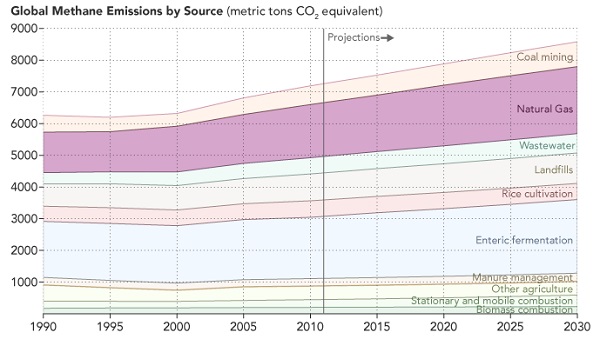 Sorry, I’ve lost the source, but it was from a recent paper. The numbers add up to 678 million tonnes, so it’s a recent number. Scientific critics of the Arctic methane catastrophe thesis worry that it distracts from dealing with sources of emissions that we can do something about. This graph, apparently from 2011 in the 2016 NASA article (you would think they has something more recent) shows past and future of anthropogenic methane emissions: