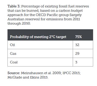 Burning fossil fuels accounts for 90% of emissions, they say (seems high to me). Using the carbon budget approach, they give this table of burnable carbon reserves: