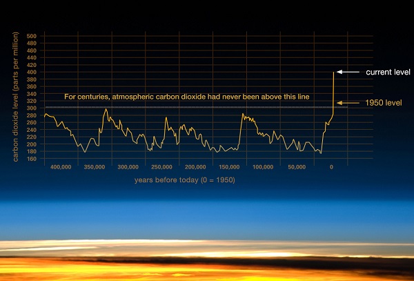 NASA has a site showing the broad evidence of how the world is changing with global warming. Here’s where we are with CO2 concentrations: