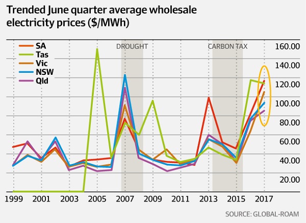 The same issue of the AFR had an article by Angela Macdonald-Smith ‘Gut-wrenching’: power prices rise 64pc in June quarter. That is, the June quarter year on year from 2016. She gives this graph of historical prices: