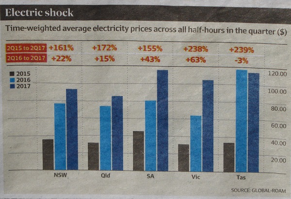 On the need for competition, Ms Conboy is singing from the usual neoliberal songbook. Mark Ludlow’s AFR article on Friday 7 Companies hit hard by soaring wholesale power prices shows pretty rugged increases in wholesale electricity prices over the two years 2015-17, from 161% in NSW to 239% in Tasmania. Of the five NEM pools there is a graph in the dead tree version. Leaving aside Tasmania as a special case, Queensland goes from slightly higher than Victoria to the lowest by a clear margin: