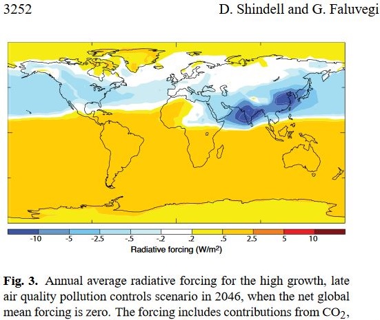 The effect of aerosols from coal-fired plants is considerable but tends to concentrate around the regions and latitudes where it is generated. This graph is based on forward projections to 2046 in a scenario where global mean radiative forcing is zero.