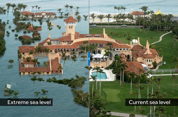 Here’s what Trump’s 126-room resort at Mar-a-Lago would look like with “10- to 12-foot rise in sea level by 2100”, which is increasingly being contemplated by mainstream scientists: