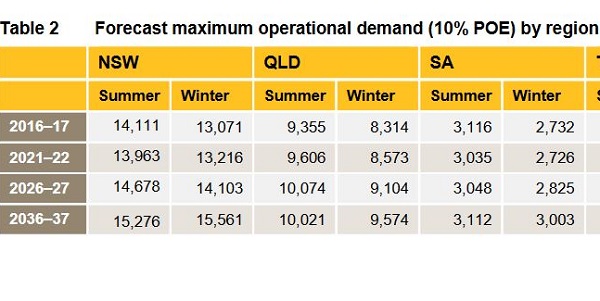 To show this effect I’ve truncated the following tables in the interests of legibility, showing forecasts for NSW, SA and QLD. Here’s the maximum daily demand:
