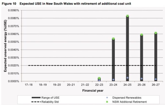 The reliability standard (USE) is the dotted line. If Liddell closes and another big coal generator shuts as well, the green dot on top of the black lines represents the risk.