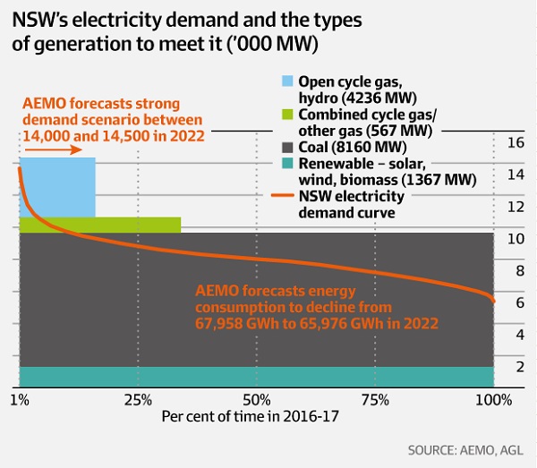 Australian Energy Market Operator forecasts that by 2022, when Liddell is due to close, NSW’s peak demand will have increased towards 14,500 MW, from about 14,000 MW now. However, at the same time, total energy consumption will continue to fall, to about 65,976 GWh in 2022 from about 67,958 GWh last financial year.