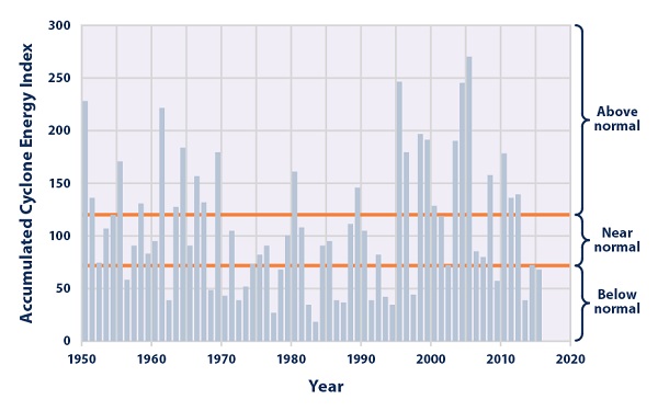 The second shows the total annual Accumulated Cyclone Energy (ACE) Index values, which account for cyclone strength, duration, and frequency, from 1950 through 2015. “Normal” is the average from 1981 to 2010.
