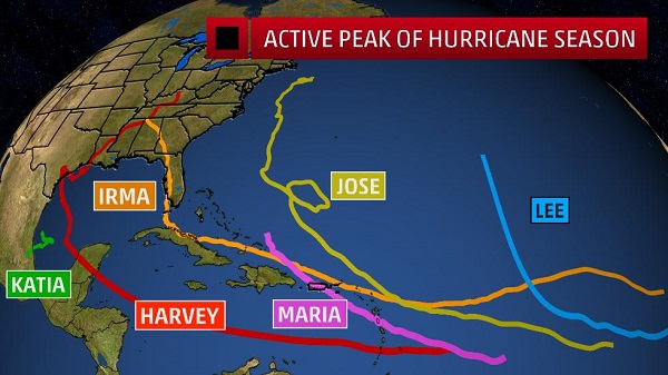 At Weather Underground it has been noted that during 30 days recently there was at least one active hurricane in the Caribbean system at all times:
