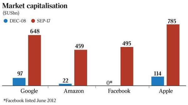 Here is the market capitalisation of the big four tech companies which have emerged since the GFC: