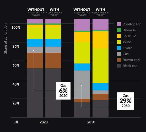 It shows gas reducing from 6% in 2020 to 3% in 2050, if the Clean Energy Target is implemented.