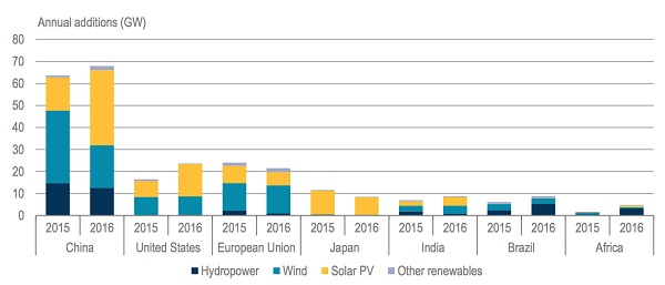 Renewable energy accounted for two-thirds of new power added to the world’s grids in 2016, the International Energy Agency said, but the group found solar was the technology that shone brightest.