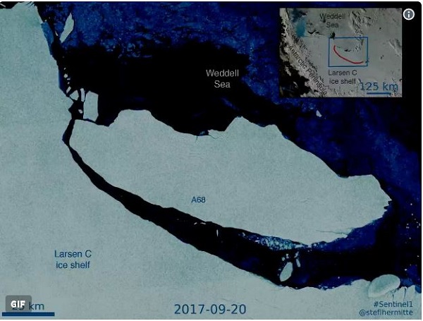Larsen C iceberg is very large – about a trillion tons, in area about equal to the state of Delaware, or four Londons, with a volume of about 462 million Olympic size swimming pools. In depth it’s about the Statue of Liberty times two.
