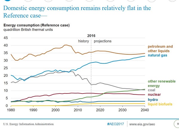 The US Energy Information Administration has done an Annual Energy Outlook, 2017, with projections to 2050. I think it was produced in January, so pre-Trump. It has many graphs, but this one of total energy consumption gives the overall idea: