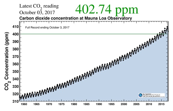 There is one thing wrong with this story. Lawrence Torcello and Michael Mann reckon the way we are going we’ll reach 2°C of warming by about 2036. Here’s what the CO2 graph at Mauna Loa looks like: