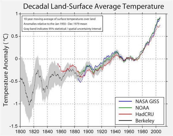Abbott uses the tired arguments about urban heat islands and measuring methods, which are said to artificially boost temperature readings. Back in 2010 a Berkeley academic Richard Muller founded the Berkeley Earth Temperature Project (BEST), which was meant to correct all the wrongs and find the truth (discussion here). This is the first graph they came up with: