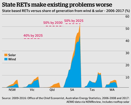 The infrographic also shows the state targets, which the ESB says can still be pursued, provided their regulations are not breached. There is no reason why firmed renewables cannot replace dirty existing electricity, provided their standards of dispatchability, as yet unquantified, are met. However, it is expected that concentrated solar towers (CST) with molten salt or other storage would qualify.