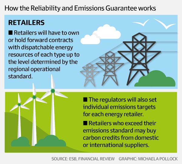 At the same time regulators will set individual emissions targets for each retailer. A specified percentage of the electricity each retailer provides must be clean. If the retailer has trouble meeting this standard they can purchase credits domestically or internationally to an as yet unspecified degree.