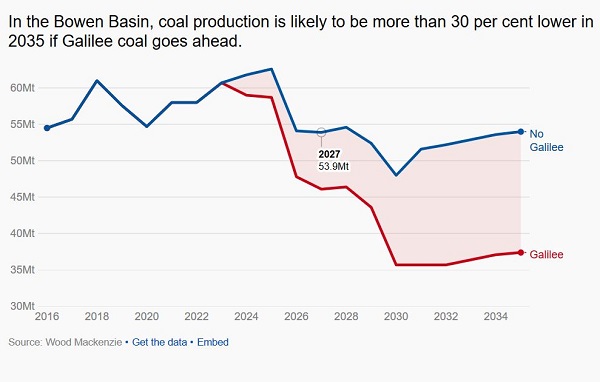 The Mine, (Carmichael) is set in the Galilee Basin. It is likely the first of up to nine mines proposed for the Basin. To mine up to 60 million tons per year, open pits 40 km long and 10 km wide are intended.[2] Adani is authorized to draw unlimited groundwater for 60 years. Massive environmental risks are apparent.