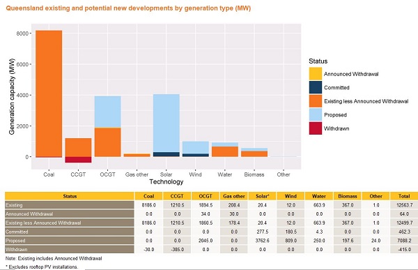The total existing capacity is 12,563.7 MW. That’s excluding rooftop solar, where over 450,000 Queensland homes now have solar panels, with the combined capacity of 1,800 MW of generation, larger than the 1,680 MW Gladstone power station, the largest in the state. So leaving rooftops aside, the existing, committed and proposed renewable amount to around 52% of current capacity.