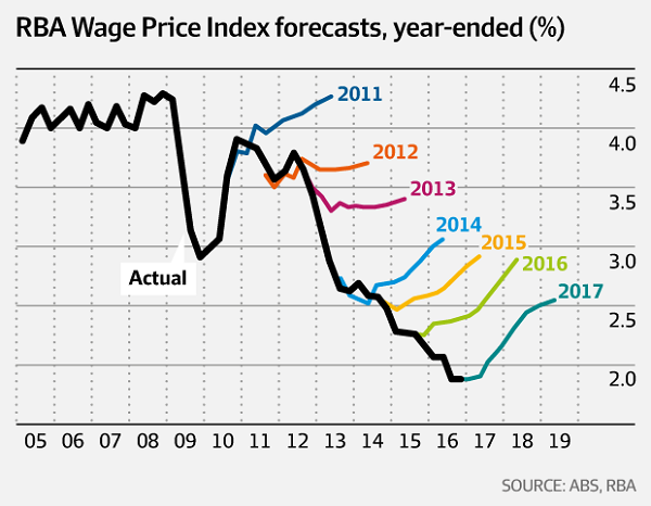 He says that the Reserve Bank, the Treasury and the Government comprise a big sheltered workshop. No-one knows what to do, so they keep telling us stories. Here is a graph of the RBA wage-price index forecasts against what really happened: