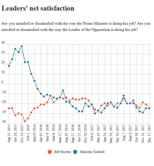 Net satisfaction with the leaders has been a disaster for both Turnbull and Shorten. The aggregate poll has Shorten on -22 (33-55) and Turnbull on -26 (31-55). This graph shows Turnbull’s fall from grace after being elected. In effect the electorate has had little taste for either since before the last election: