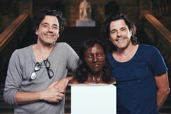 The two white guys in the post with Cheddar Man are Dutch artists Alfons and Adrie Kennis, who specialise in palaeontological model making, according to The Sun.