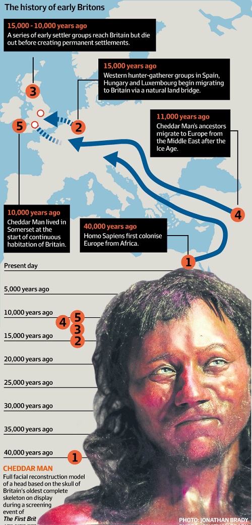 For something completely different the first Britons were “dark to black”, according to a Natural History Museum DNA study. Analysing a 10,000-year-old Somerset skeleton known as “Cheddar Man” they also had coarse black hair, high cheek bones and blue eyes. They think.