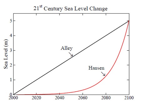 This is based on the notion of ice sheet loss doubling every 10 years, from memory. Hansen’s intention was twofold. Firstly, it is far too early to work out what is going to happen. Secondly, large numbers cannot be ruled out.