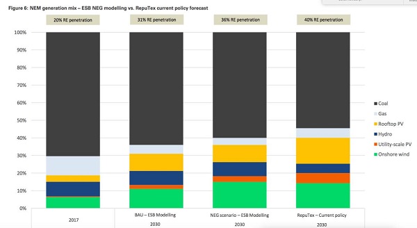 Reputex found that the ESB’s claims that the NEG would lift investment in renewables to 36 per cent of total production from 31 per cent under business as usual to be wrong. I understand Frontier Economics does the modelling for the Energy Security Board. Reputex compares their own modelling with that of the ESB. This graph shows the energy mix: