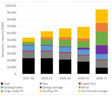 In forward planning the period from 2030 to 2036-37 has significance, because ~10 GW of coal generation is projected to retire. Here is the generation mix capacity to 2036-37 under a “neutral” scenario:
