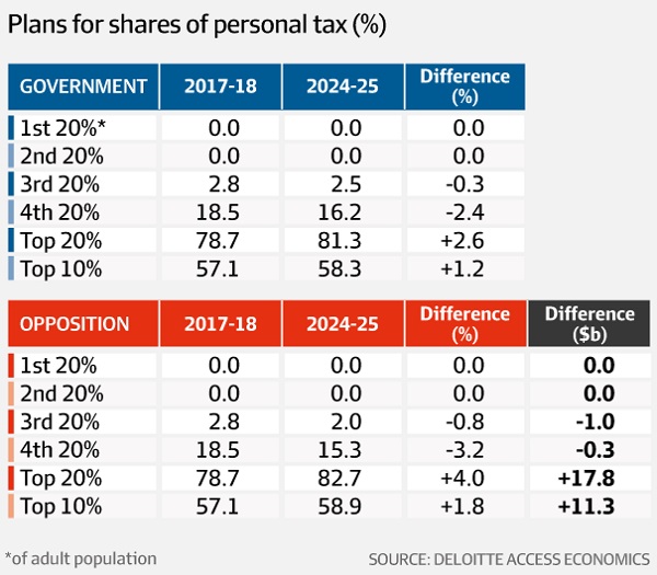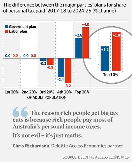 According to Jacob Greber Chris Richardson pointed out a few days ago that 47 per cent of tax payers actually don’t pay any tax. Richardson’s main point is that the conversation should be about tax share, rather than the amount of tax paid by the rich. In both policy offerings the rich end up paying more. The article contained this graph: