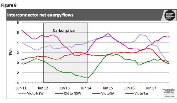 Large-scale solar has barely started, but the report suggests that it will figure more prominently in the future. Monitoring the interstate interconnectors is instructive: