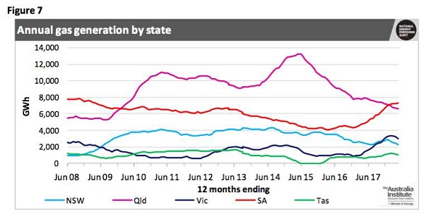 South Australia has tipped into becoming a net exporter to Victoria, which is stunning. Victoria and NSW are now in balance, but the flow from Queensland to NSW is significant and increasing. The following graph shows, as I’ve said elsewhere, that gas is being used most in Queensland and SA, and is plays a large role in balancing the grid.