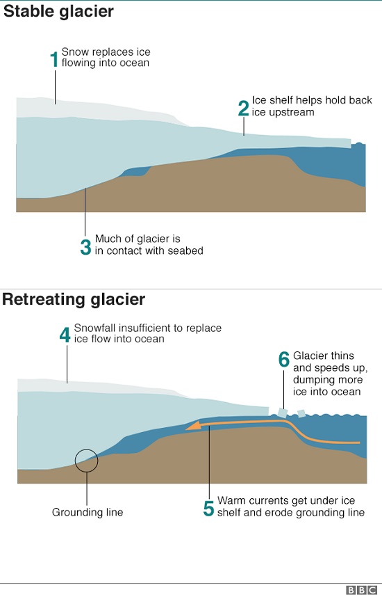 The huge river of ice is thinning, speeding up, and the ‘grounding line’ is retreating inland, allowing the sea water to penetrate further under the ice. This image explains: