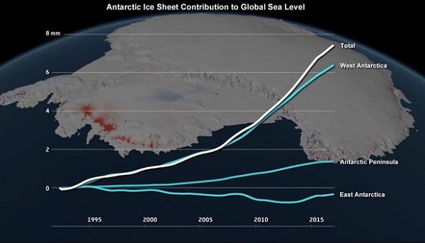 This image shows the contribution to sea level rise in millimetres of West Antarctica, the Antarctic Peninsula and East Antarctica.