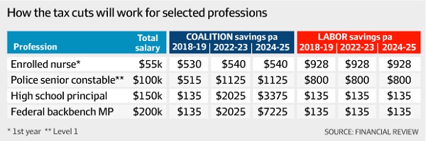 But Labor is offering a maximum tax cut of $928 a year for middle-income earners – the Coalition’s $530 plus an additional $398 promised by Labor. And for the 2.4 million low-income earners promised $200 a year by the Coalition, Labor will give them an extra $150 for a total $350.